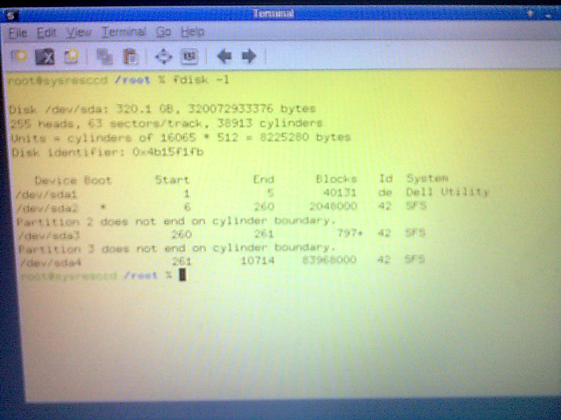 /dev/sda1                 1         5           40131        de    Dell Utility