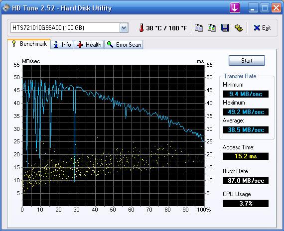 Nie zgodzę się z Tobą, że 90% zwolnienia dysku jest przez fragmentacje. Obrazu z HDTune z dysku, który robiłem nie mam ale w załączniku dałem podobny. Od 0% do 20%, tam gdzie był stary system, są szpilki ze spadkiem odczytu do 2-5MB/s. Uważam, że to najbardziej spowalnia pracę systemu.
