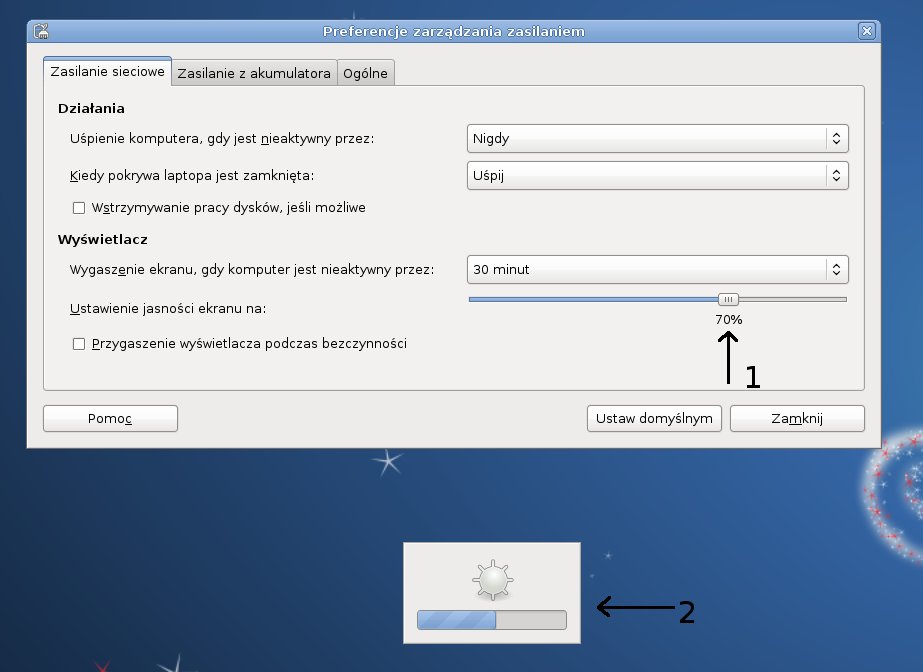 W Debianie Squeeze 6.0.3, gdy za pomocą klawiszy funkcyjnych próbuję regulować jasność ekranu, na ekranie pojawia się okienko z regulacją, ale nie chce ono zejść poniżej poziomu pokazanego w poniżej.