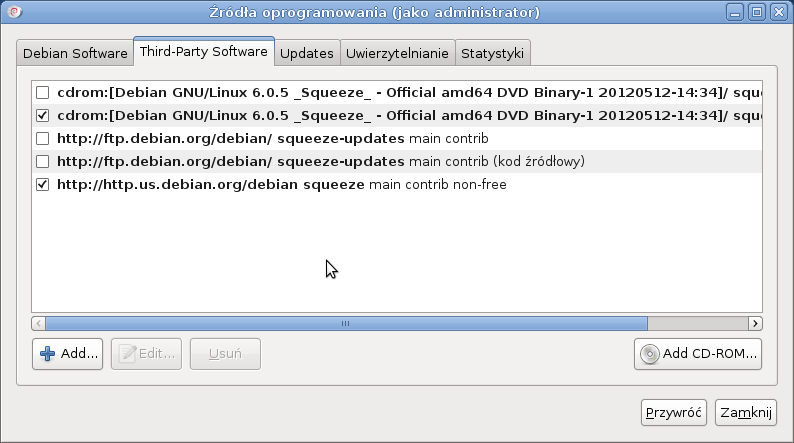Ignorowane cdrom://[Debian GNU/Linux 6.0.5 _Squeeze_ - Official amd64 DVD Binary-1 20120512-14:34]/ squeeze/contrib Translation-pl