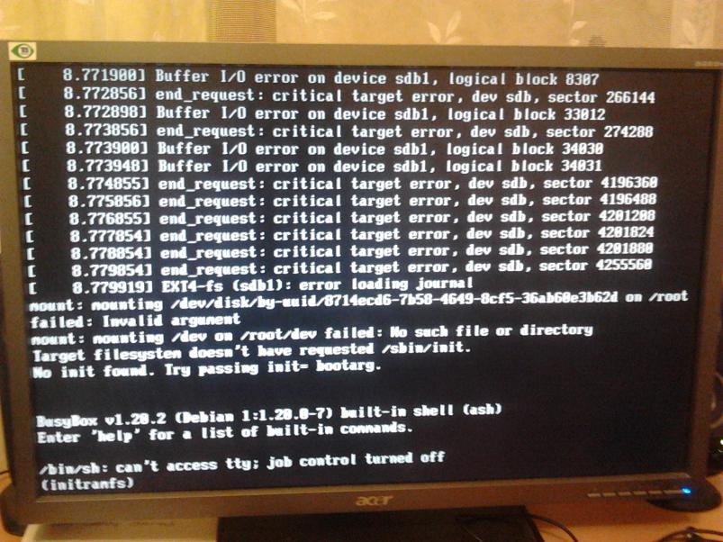 Z racji tego, że komputer zawieszał się coraz częściej oraz popsułem konfigurację Apache, postanowiłem przeinstalować Debiana. Instalacja na tym samym pendrivie nie powodziła się (instalator wyrzucał błędy coś związane z niemożnością zapisania układu partycji). Wybrałem to tego celu innego pendriva (kiedyś zainstalowany był na nim XBMC /w wersji opartej o Ubuntu/). Standardowo partycja "SWAP" (być może to go uszkodziło) i partycja główna "/". Tu jednak system nie podziałał zbyt długo - całe 3 dni. Przy próbie startu wyskakują takie komunikaty.