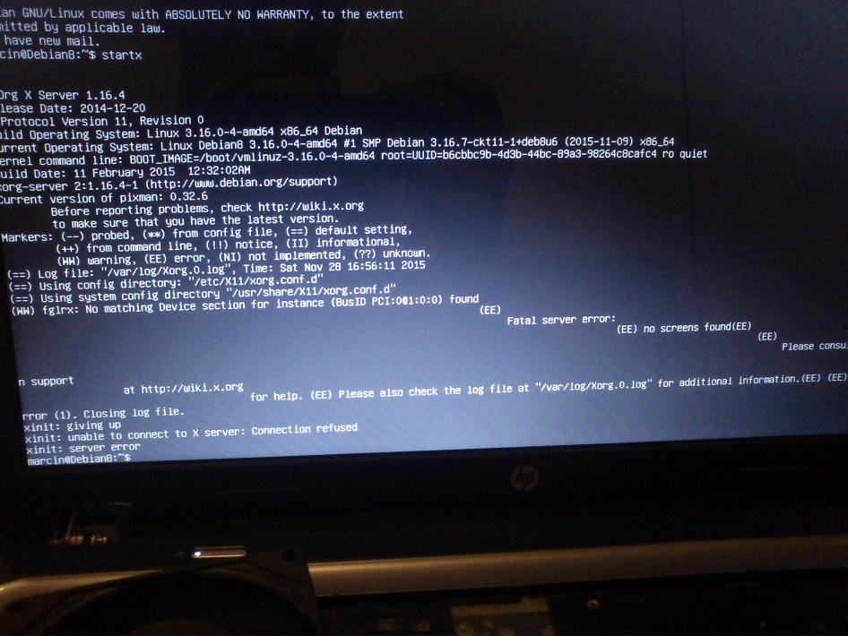 Przedstawię zdjęcie z próby wykonania polecenia startx.