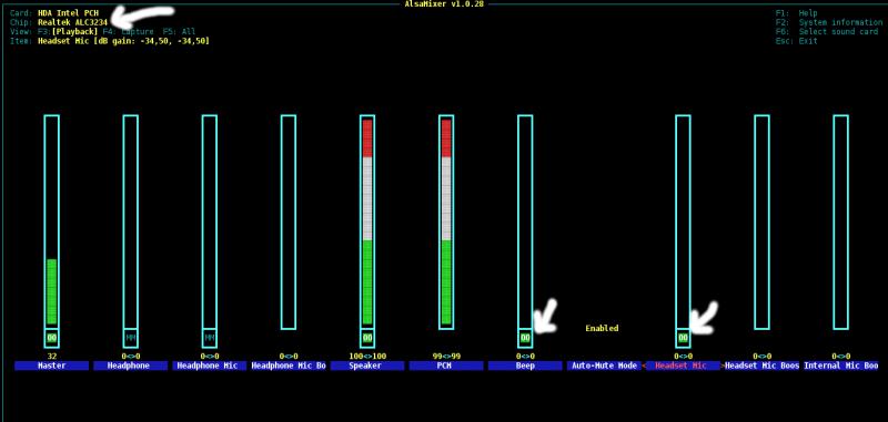 2. wpisujemy w konsoli alsamixer (jako zwykły user) i przyciskiem F6 wybieramy naszą kartę muzyczną.