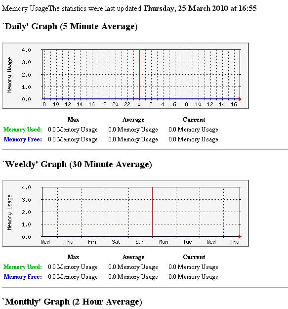 env LANG=C /usr/bin/mrtg /etc/mrtg.cfgOtrzymuję puste wykresy i puste wartości, jak na screenie: Już nie wiem, co może być nie tak - skrypt daje w porządku wartości, a statystyk MRTG nie generuję.