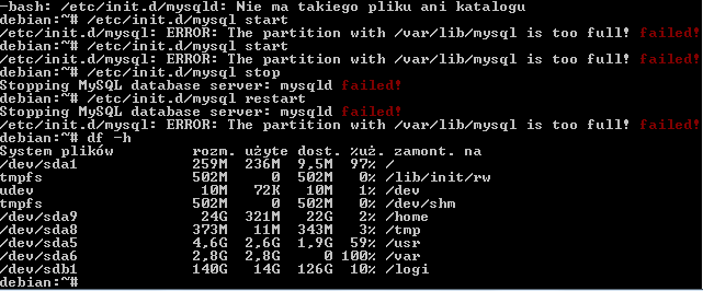- Utwórz katalog /var/lib/mysql na jakimś osobnym zasobie z wolnym miejscem, przenieś tam zawartość oryginalnego folderu. W miejsce oryginalnego folderu utwórz linka do /var/lib/mysql.