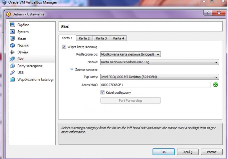 Karta1: Intel PRO/1000 MT Desktop (Mostkowana karta sieciowa, Karta sieciowa Broadcom 802.11g)