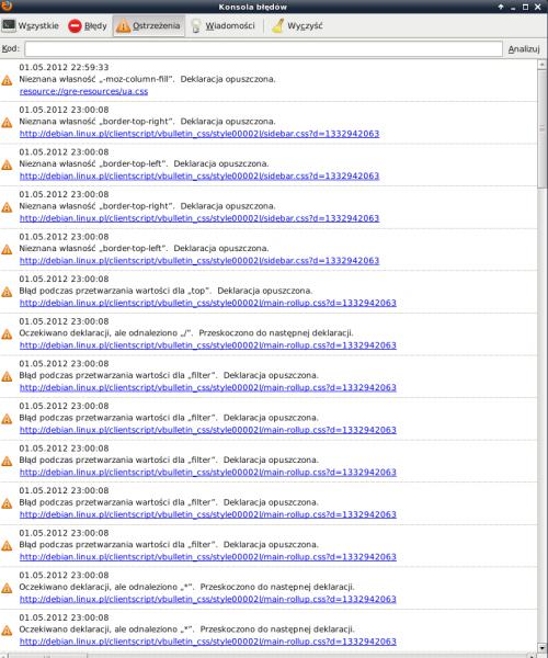 Czas: 01.05.2012 23:00:08 Ostrzeżenie: Nieznana własność „border-top-right”. Deklaracja opuszczona. Plik źródłowy: [URL]http://debian.linux.pl/clientscript/vbulletin_css/style00002l/sidebar.css?d=1332942063[/URL] Wiersz: 1- To są same ostrzeżenia. W zakładce błędów nie było żadnego wpisu. Natomiast w zakładce wiadomości: